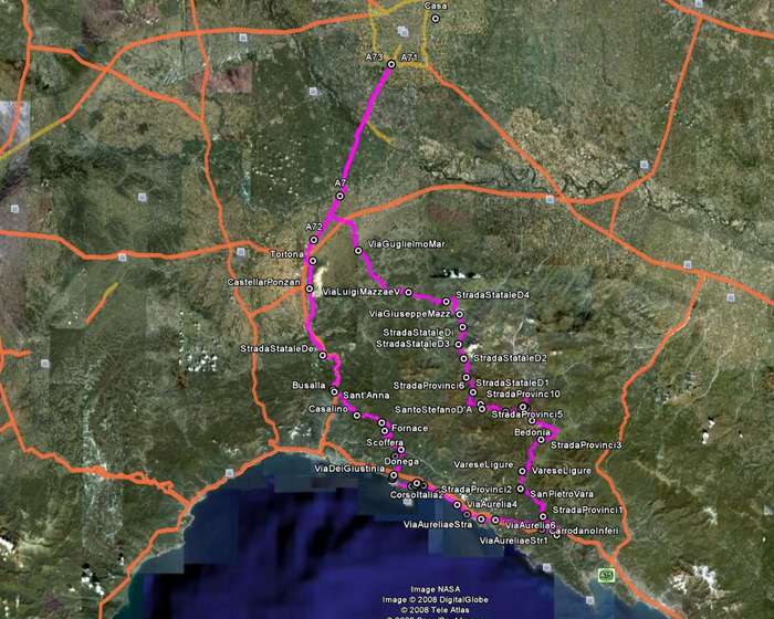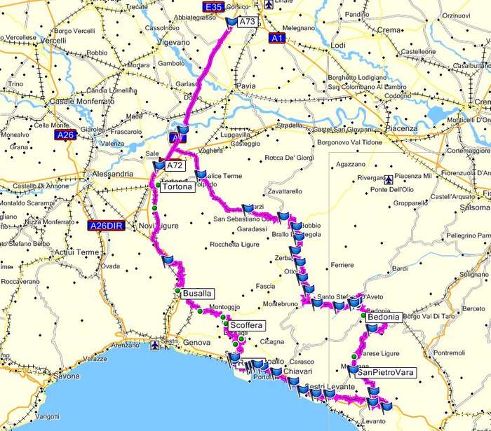 Milano Tortona casello. Busalla P.sso della Scoffera Uscio Recco Lungomare, Chiavari, Sestri Levante P.sso del Bracco Carrodano San Pietro di Vara Varese Ligure P.sso del Cento Croci Bedonia P.sso di Montevaca P.sso del Tomarlo Santo Stefano D'aveto Val D'Aveto Marsaglia Val Trebbia Bobbio P.sso del Penice Varzi Milano
