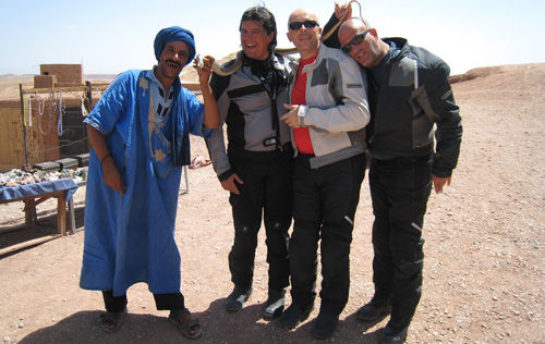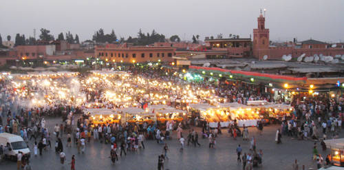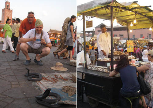 Ad ogni modo piazziamo le nostre cose in stanza e ci incamminiamo verso la Medina sino a giungere alla famosa piazza Djemaa el-Fna. Sulla piazza troviamo, oltre ai tavolini delle bancherelle di spiedini di carne e pesce, un numero imprecisato di artisti di strada che fanno esibizioni per i numerosi turisti, cantastorie, incantatori di serpenti, eccetera.