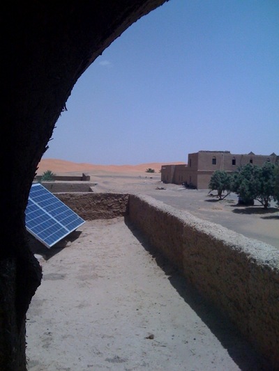 Merzouga! Questa ¨¨ la vista dalla terrazza della nostra camera :-) Dune a 100 metri, dromedari, sabbia, 45 gradi e tutto il kit. Siamo arrivati senza problemi percorrendo una lingua di asfalto in mezzo al deserto, impressionante. Oggi relax e domani facciamo i turisti veri, 4x4, giro con i dromedari sulle dune etc. Ieri sera abbiamo trovato ben 2 chiodi nella gomma posteriore di Cencio, tirati su lungo la strada. Tutto riparato in meno di un quarto d'ora! Ripartiamo dopodomani mattina verso la Valle del Dades, dove dovrebbe fare "freschino". Bye